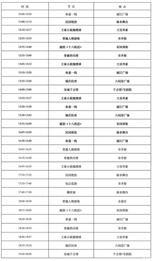 第五場:18:30-19:30第六場:19:00-20:00第七場:20:00-21:002、演出所在命懸一線的所在為麗江廣場;民間絕技的所在為臨水舞臺(tái);招婿拋繡球所在為王員外家;穿越快閃秀的所在為市井街;
