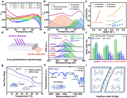 圖2 UGPU的室溫超快速修復性能為了揭示UGPU的快速修復的機理,研究人員通過寬頻介電松弛譜、X射線光電子能譜、二維紅外光譜、時間相關紅外光譜和顯微紅外光譜等一系列手段,解析UGPU超快速修復的內在機制(圖3),該機制主要體現在: