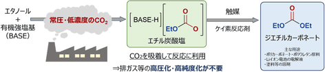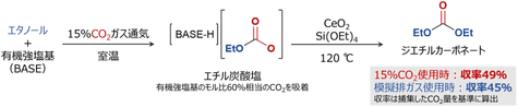 此外,研究團隊還開發了一種利用CO2化學吸附作為在常壓和低濃度反應中直接利用CO2的尿素衍生物合成方法(2021年5)在新的研究中,研究團隊利用CO2在乙醇與有機強堿之間的化學吸附反應,與尿素衍生物合成法相似,開發了一種以常壓、低濃度CO2為原料,以四乙氧基硅烷為原料的碳酸二乙酯合成方法。