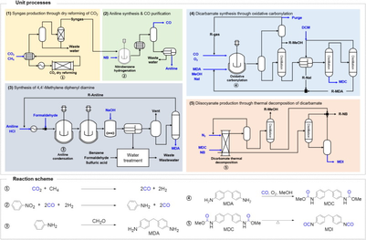 韓國化學技術研究院 (KRICT)的研究人員提出了一種合成二苯基甲烷二異氰酸酯 (MDI)的可連續(xù)工藝該工藝利用CO2生產(chǎn)合成氣,然后通過加氫反應分離合成氣,胺的氧化羰基化形成4,4-二苯甲烷二氨基甲酸甲酯(MDC),然后熱分解產(chǎn)生MDI。