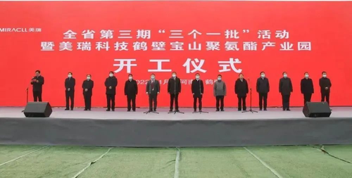 2022年1月4日,美瑞新材鶴壁寶山聚氨酯產(chǎn)業(yè)園項目舉行開工儀式項目總投資約35億元,分兩期建設(shè):一期投資約20億元,主要建設(shè)年產(chǎn)10萬噸特種聚氨酯彈自結(jié)皮性體、8萬噸苯二胺、5萬噸1,4環(huán)己二胺和1,4環(huán)己烷二異氰酸酯等生產(chǎn)線;