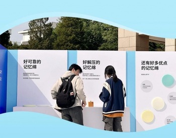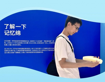 在現場,萬華化學傾力打造了一隅睡眠空間,為展示質料的差別特性和百變優勢,制定了專屬于大學生群體的通關任務,從聚氨酯記憶綿質料為源頭,逐一讓同學們了解并體驗到以記憶綿床墊、枕頭等產物的慢回彈、身體貼合等特性如何助力科學睡眠。