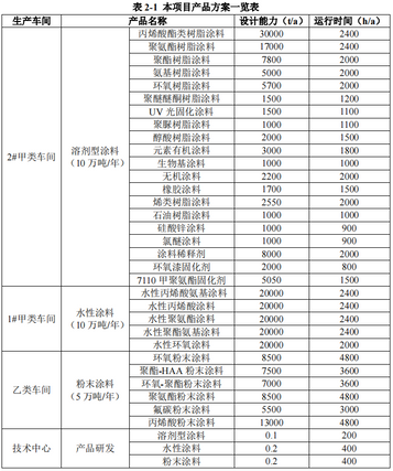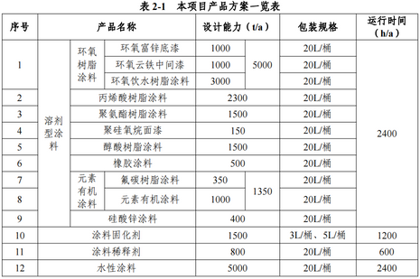 項目建成后,年產 5000 噸環氧樹脂涂料、2300 噸丙烯酸樹脂涂料自結皮、1500 噸聚氨酯樹脂涂料、150 噸聚硅氧烷面漆、1500 噸醇酸樹脂涂料、500 噸橡膠涂料、1350 噸元素有機涂料、1500 噸涂料固化劑、800 噸涂料稀釋劑、400 噸硅酸鋅涂料、5000 噸水性涂料。