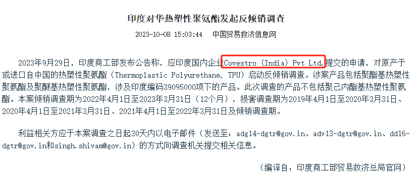 熱塑性聚氨酯(TPU) 值得關(guān)注的是,申請對原產(chǎn)于或進口自中國的熱塑性聚氨酯啟動反傾銷的發(fā)起者居然是科思創(chuàng)(印度)公司科思創(chuàng)(印度)以中國與印度生產(chǎn)的貨物完全相同,且技術(shù)規(guī)格、質(zhì)量、功能和用途方面無一直插,且科思創(chuàng)(印度)是印度唯一的TPU生產(chǎn)商,占印度生產(chǎn)量100%為由,提交申請。