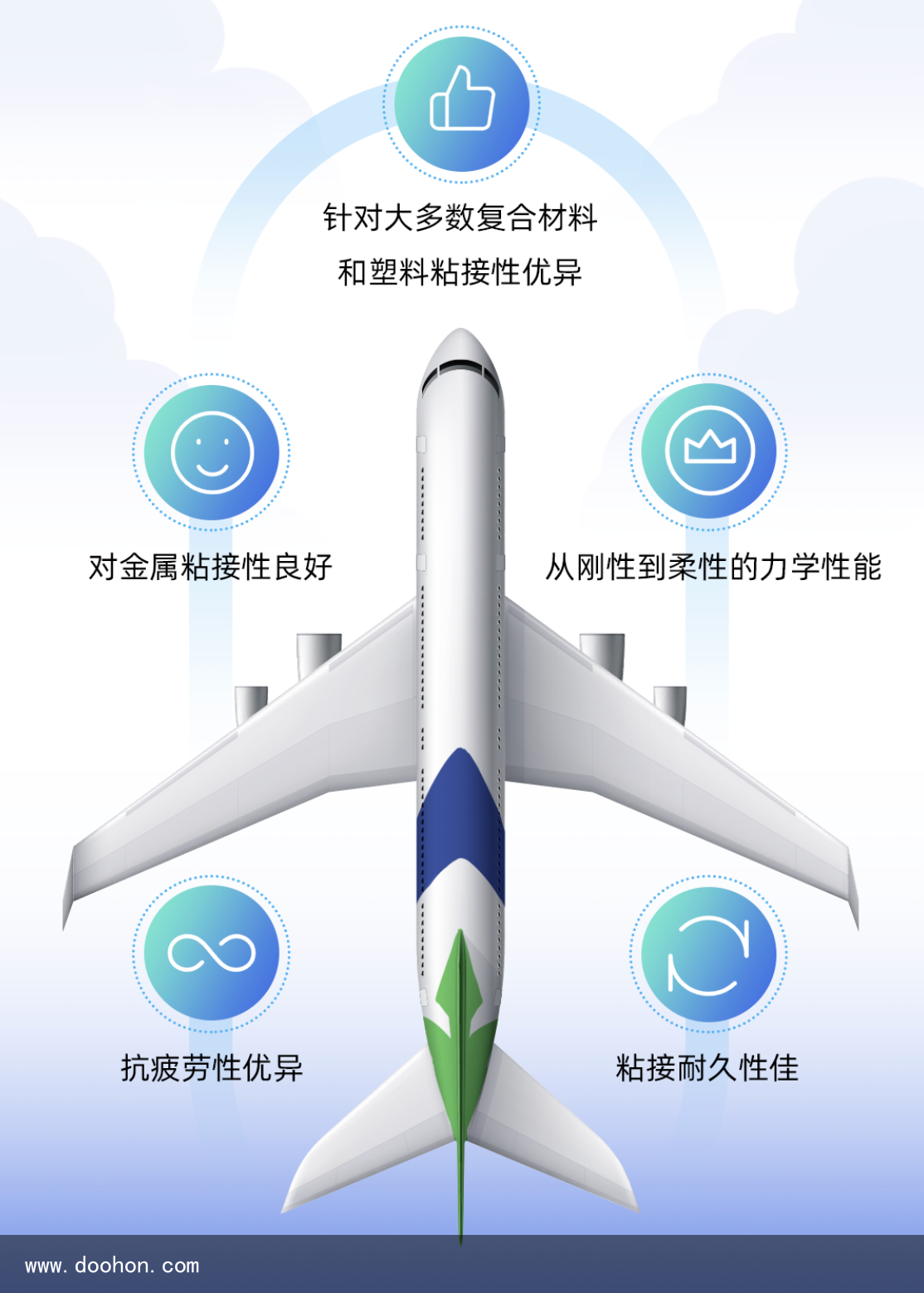 URALANE?聚氨酯膠粘劑:減重大師,助力機(jī)體輕量化 除了蜂窩板,亨斯邁URALANE?聚氨酯膠粘劑還可在其他多種基材上實(shí)現(xiàn)聚氨酯優(yōu)異的粘接性能,包含座椅、洗手間、行李架、廚房和立體空間等內(nèi)飾部件,以及短艙、起落架、艙門和利用面等外飾部件。